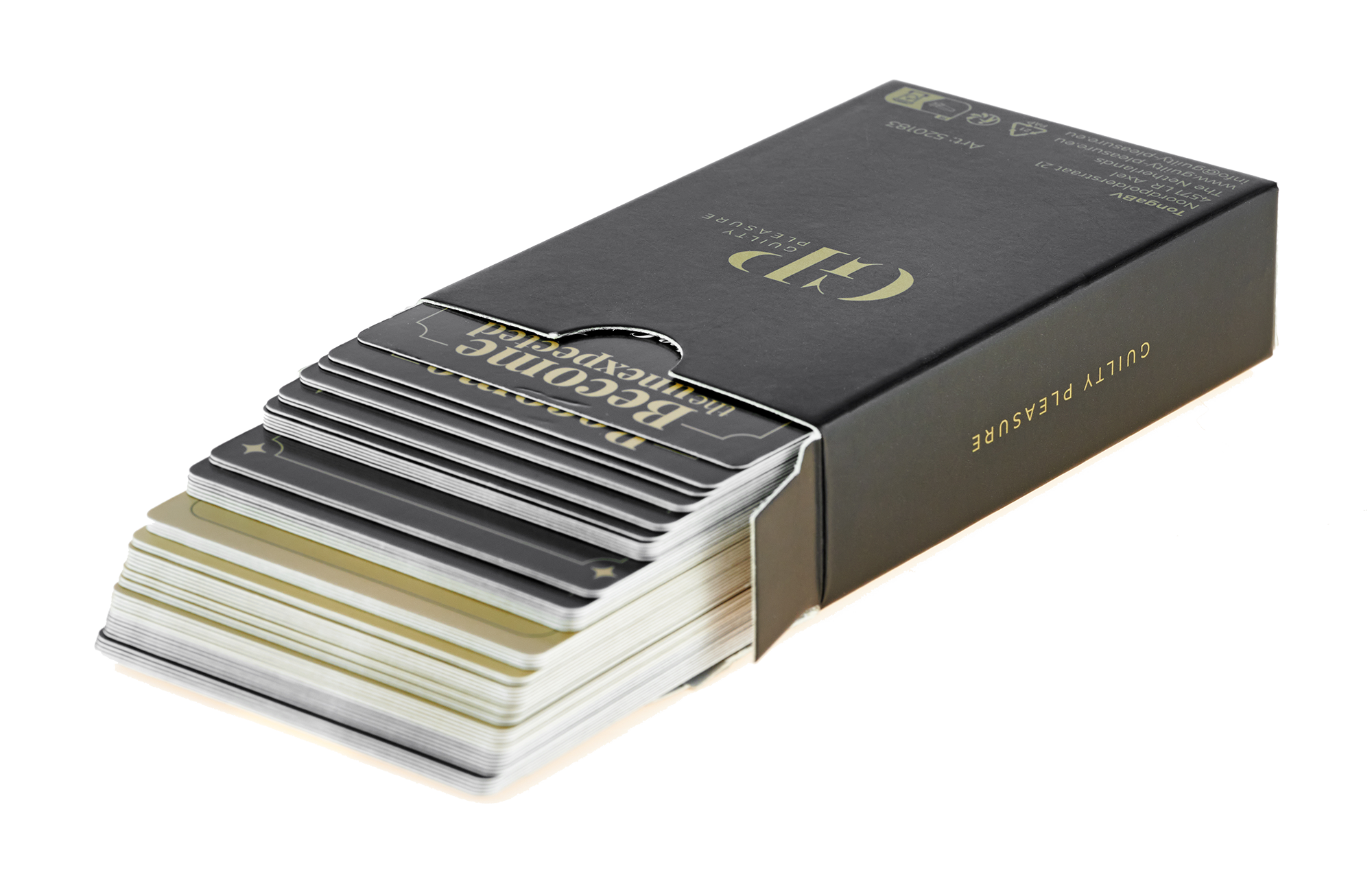 Guilty Pleasure Card Game är ett sensuellt och lekfullt kortspel för par som vill komma närmare varandra, både mentalt och fysiskt. Spelet är skapat för att bryta vardagsmönster, öppna upp för samtal och låta nyfikenhet styra kvällen.