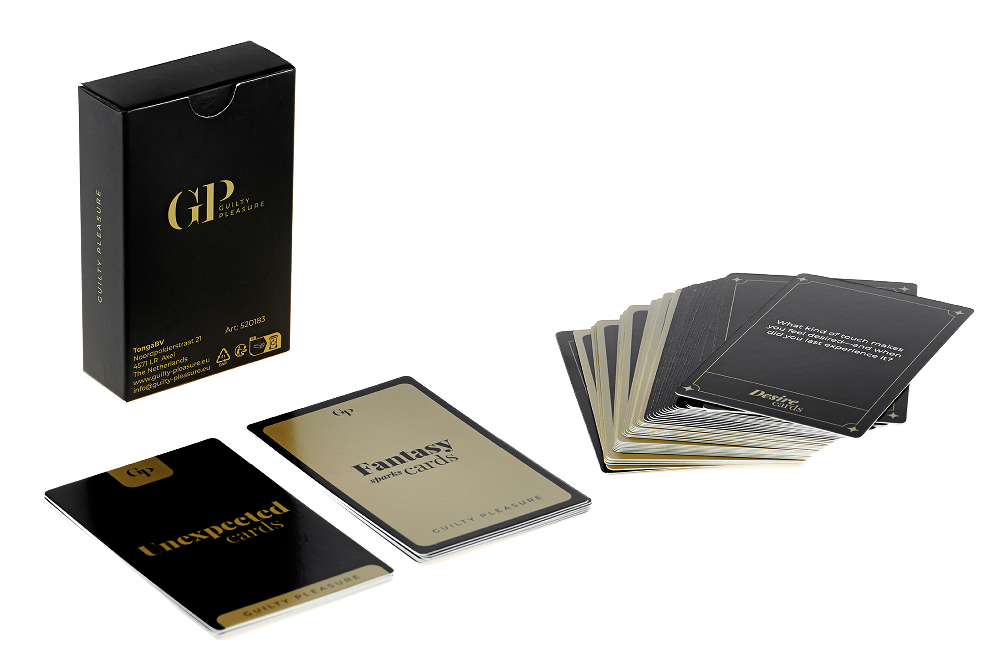 Korten är uppdelade i flera olika kategorier som var och en bidrar med sin egen dynamik. Vissa kort bjuder in till förföriska frågor, andra till handling, rollspel eller oväntade vändningar. Tillsammans skapar de ett naturligt flöde mellan samtal, skratt, spänning och intimitet.