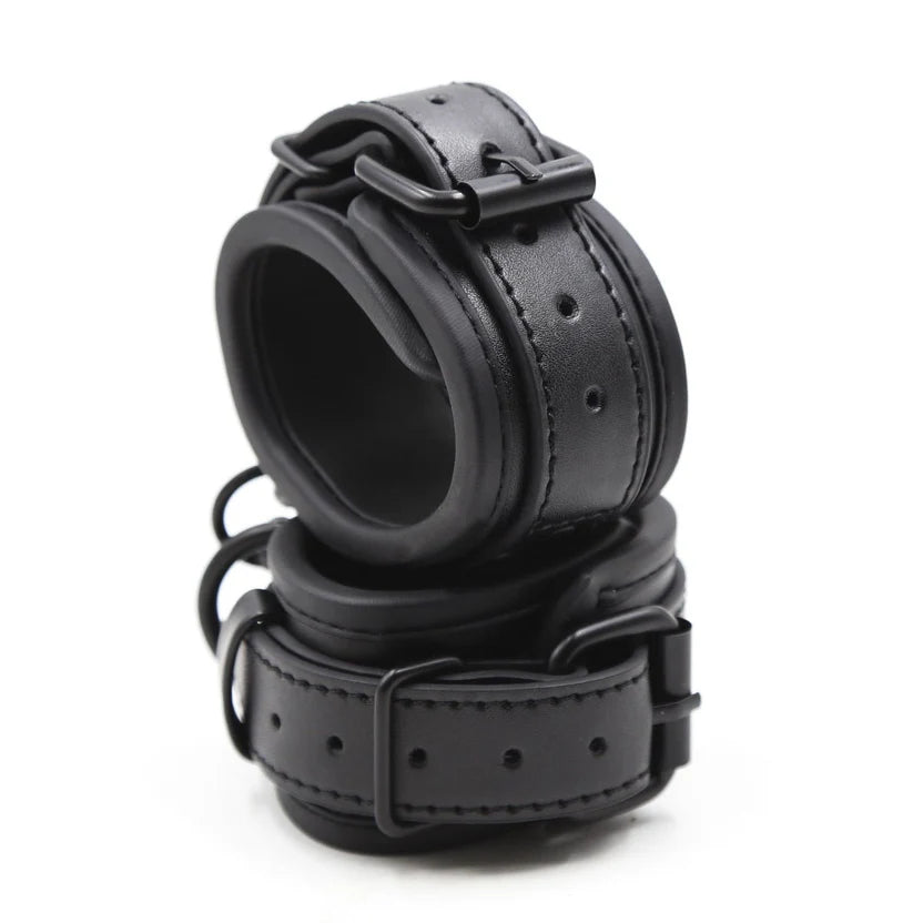 Justerbara handbojor i faux läder för bondage och fixering med stabil passform och vadderad insida. Designade för att sitta säkert utan att skava, även vid längre användning. Handbojorna justeras enkelt med spännen så att du får rätt passform oavsett handledsstorlek. De sitter stadigt på plats och ger en trygg känsla utan att bli obekväma.
