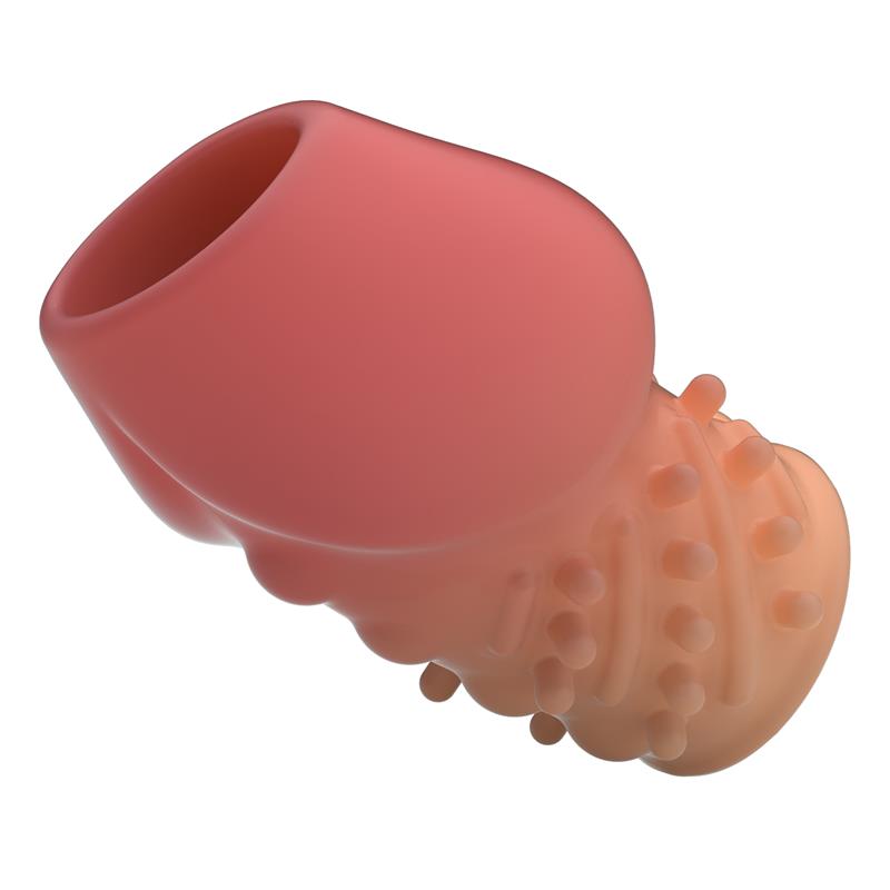 Den texturerade utsidan med upphöjda knoppar ger extra stimulans för partnern, samtidigt som materialet skapar en lätt åtstramande känsla som kan bidra till ökad uthållighet.