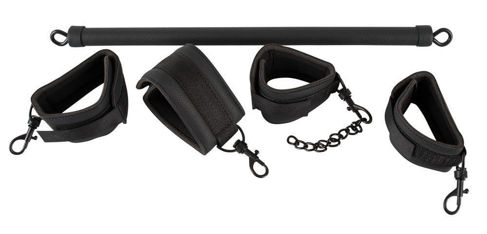 Spreader Bar är ett stabilt bondage-set med stång, handledsbojor och fotbojor. Den är designad för att hålla armar eller ben isär och skapa en fixerad position med tydlig kontroll.